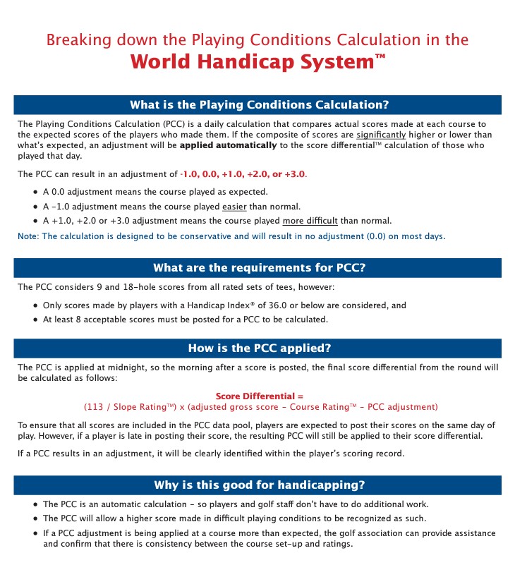 The range of the PCC adjustment is -1 to +3, with a negative (-) adjustment meaning the course played easier than expected, and a positive (+) adjustment meaning the course played more difficult. On most days, the PCC will be zero (0). If a PCC is applied following one of your rounds, it will be clearly identified within your scoring record.